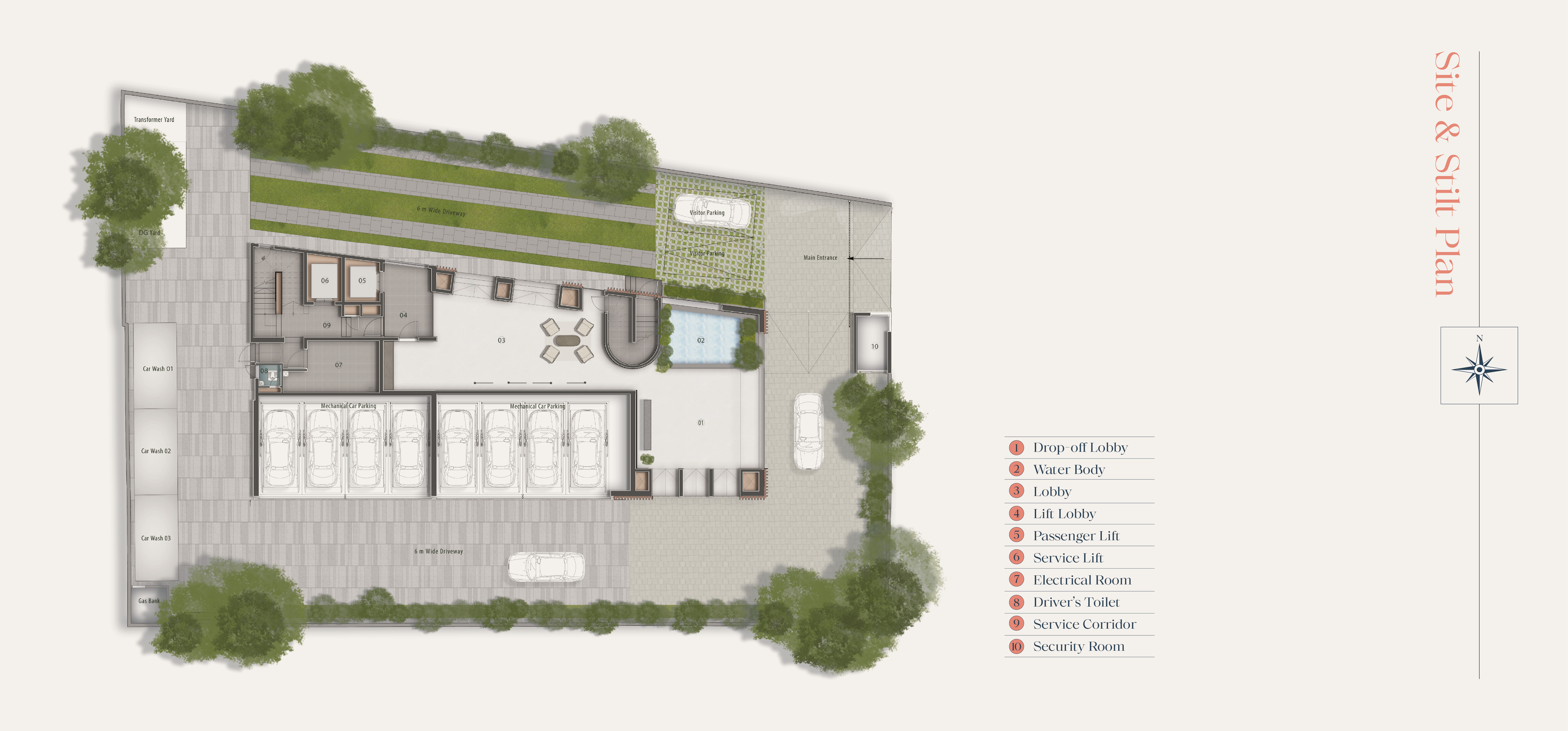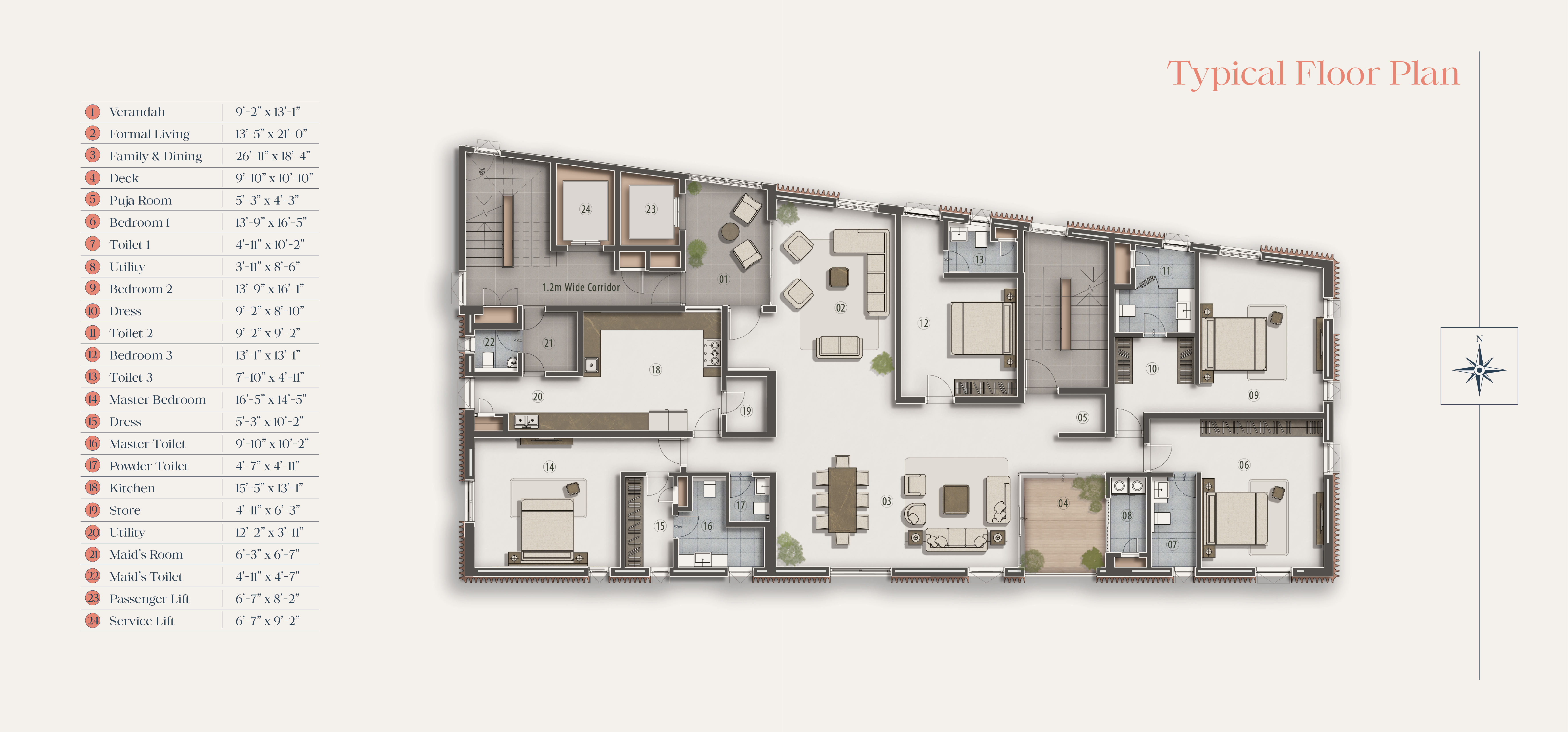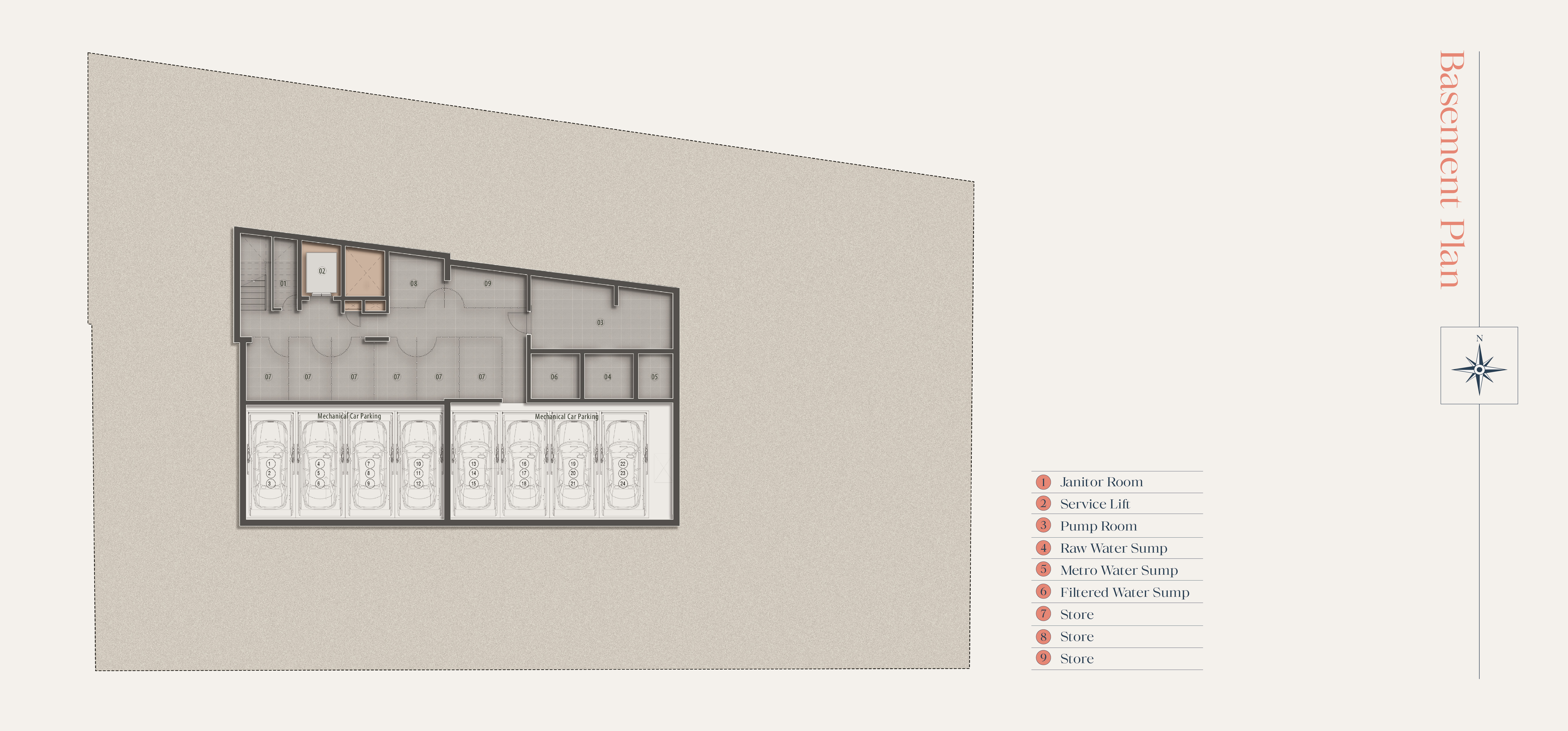 The development features a single exclusive block comprising a basement, stilt level, and eight residential floors. Each expansive 4 BHK residence spans approximately 4,827 sq. ft., offering refined and spacious luxury living.
